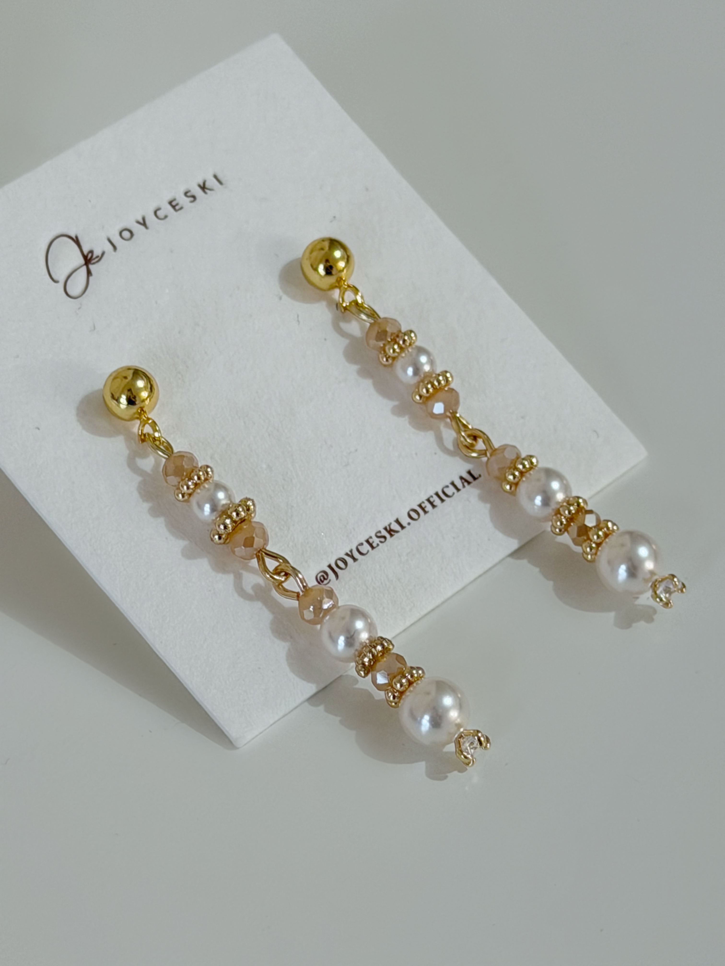 Peachlight Bloom 曦光花語 🍑 蜜桃色 + 金色配件 + 白珍珠 如晨曦中盛開的花朵,溫柔而充滿希望, 蜜桃色水晶如初春花瓣,白珍珠如晨露,金色配件添上暖陽感,適合甜美系造型。 米白珍珠蜜桃色 長耳環 HKD 158