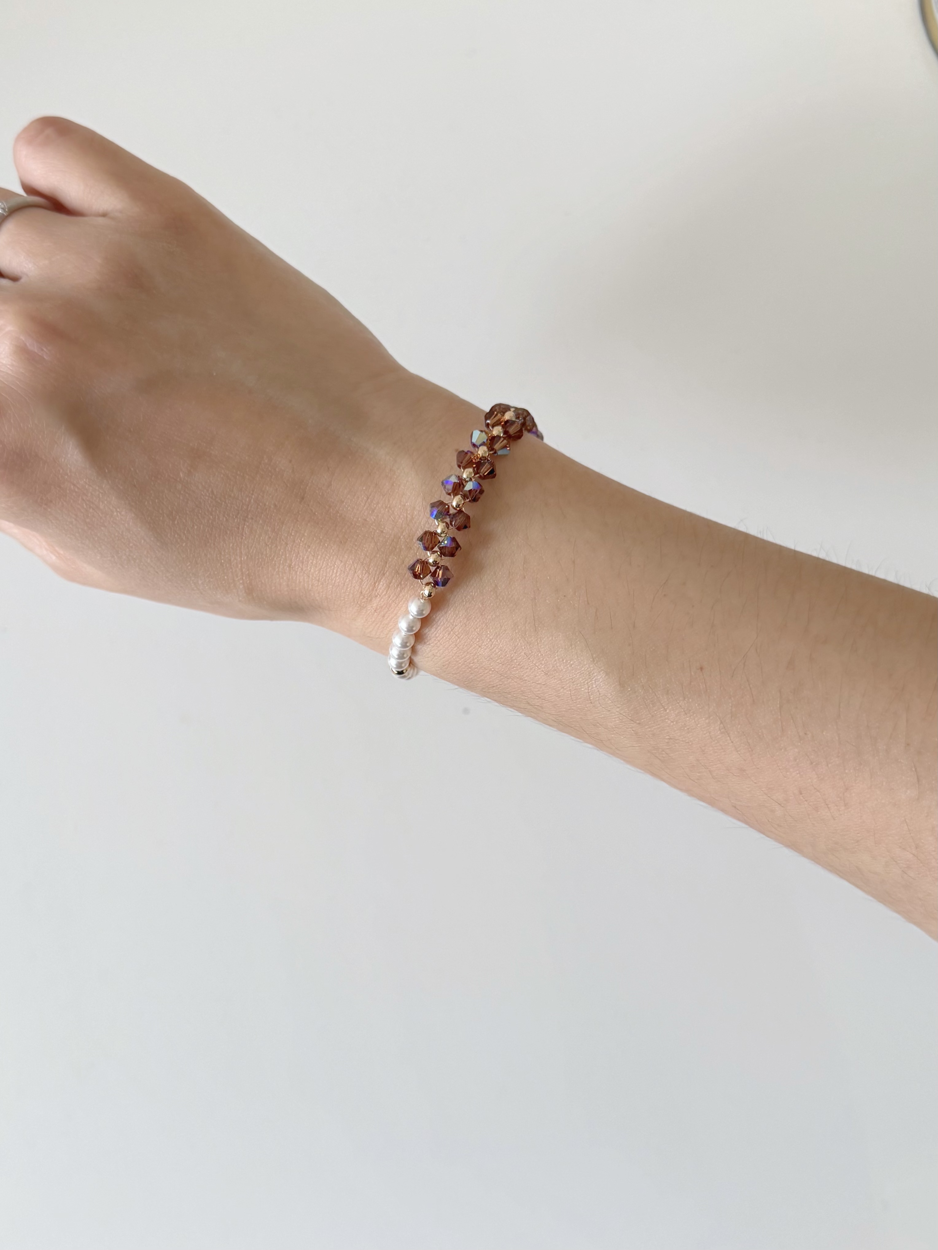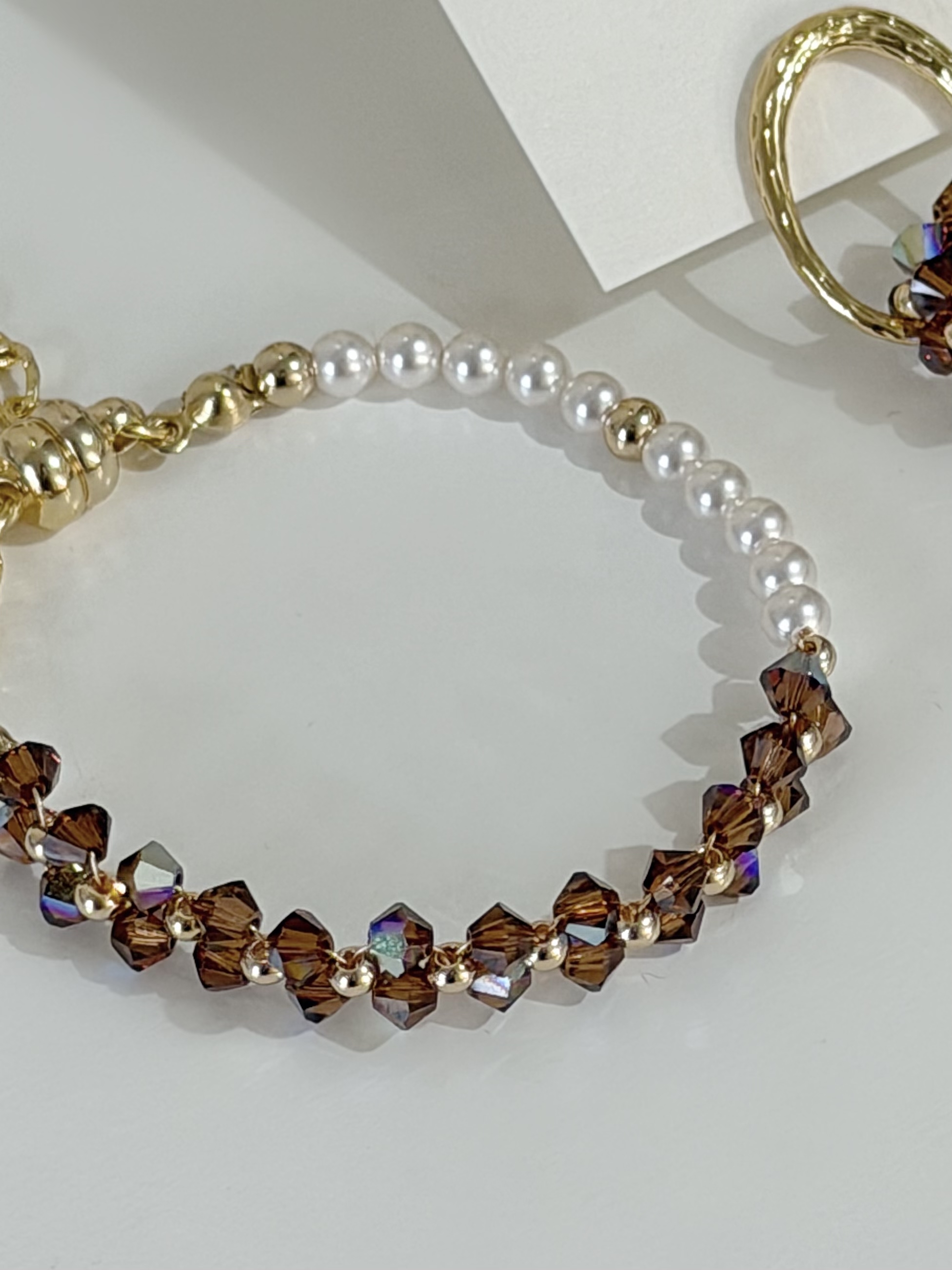 Bloomlight Series 花光系列 Twilight Meadow Bloom 暮野花光 如黃昏下的野花,在沉靜中閃爍微光,象徵堅韌與柔美 「暮」暗示深色調與日落時分的啡紅光影, 「野」帶出自然、泥土、原始的啡色質感. 純白珍珠與深琥珀水晶交織形成對比, 溫婉花影, 乾淨清雅、帶女神氣場。 象牙白珍珠深琥珀水晶手鍊 HKD229 象牙白珍珠深琥珀水晶耳環 HKD198 淺琥珀水晶耳環 HKD198