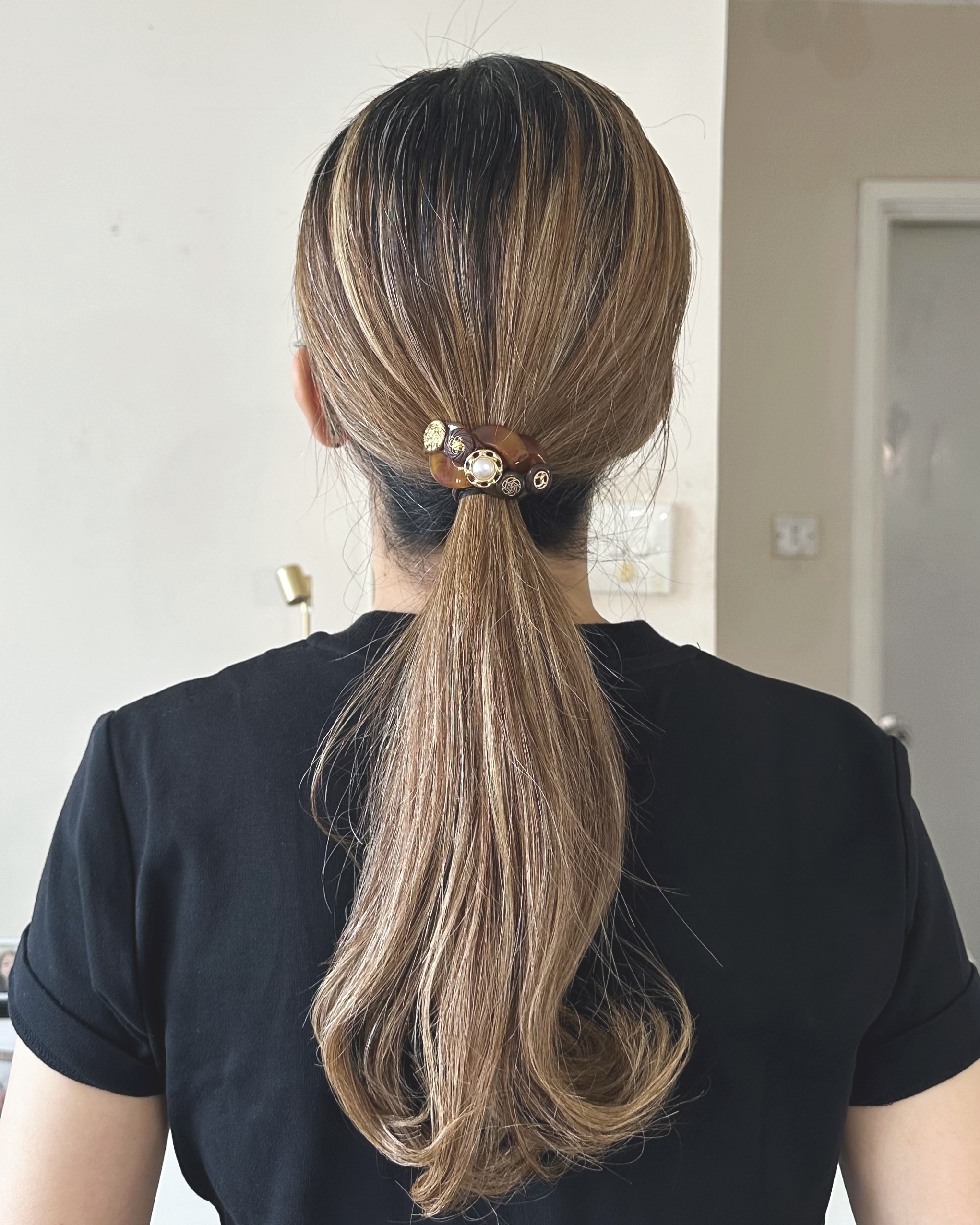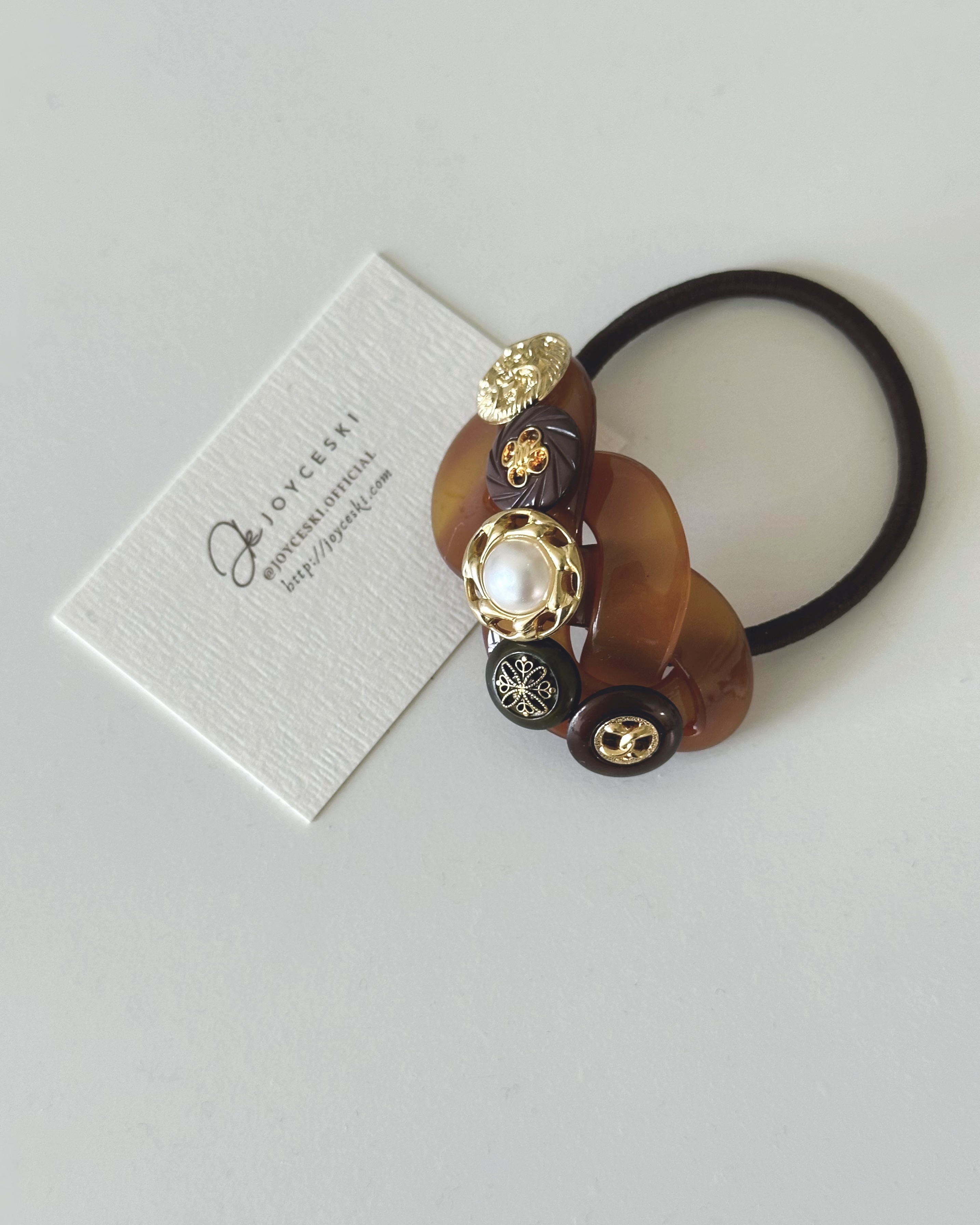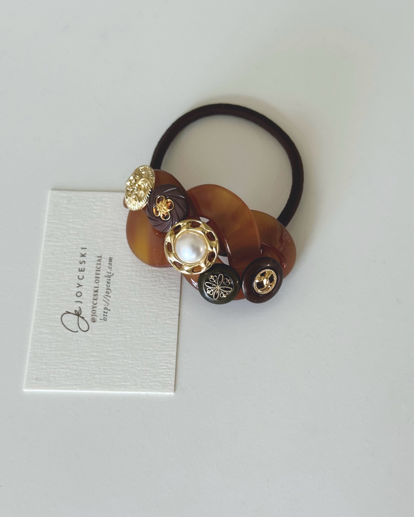Vintage Button - Resin Hair Rubberband / Camel & Black