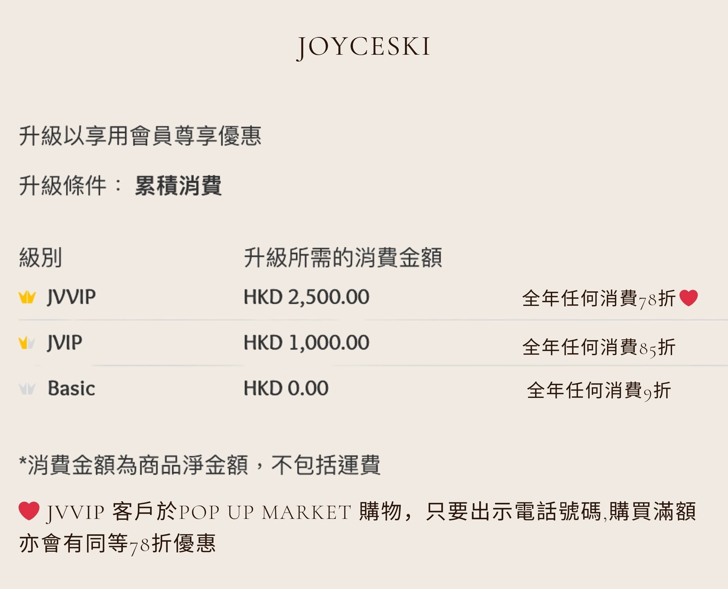 註冊成為Basic會員購買正價款式即時享9折優惠,累積購物滿$1000成為JVIP購買正價款式享全年85折.